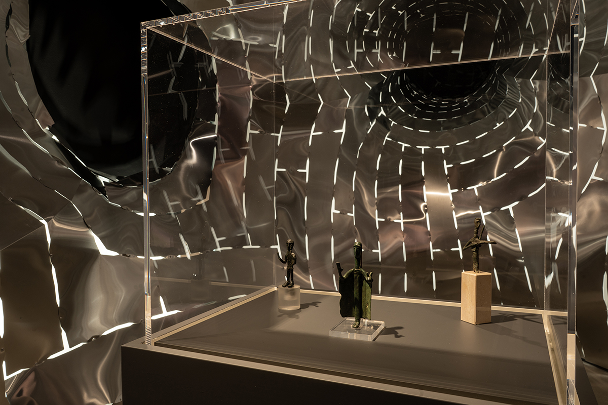Lo spazio dell’arte, infatti, è visto come un luogo esperienziale generato con strumenti di prototipazione virtuale, dove spazio e pubblico si integrano e si attivano a vicenda, traguardando il tempo dell’arte: da una parte quello storico, passato, rappresentato idealmente da una scultura nuragica, con tutto il suo portato mitico e assoluto insieme, come segno eterno di una presenza iconica delle nostre origini, “da dove veniamo”, il nostro retaggio arcaico; dall’altra parte, quello del futuro, digitale, il “dove andiamo” simbolizzato dall’immaginario incorporeo e aurorale della luce epifanica di un sole doppio, una prospettiva e, al contempo, una nuova genesi, ispirata alla classica iconografia del sole nascente, di matrice anarchica, speranza di un avvenire radioso, allegoria di una rigenerazione e di un nuovo senso dell’abitare dell’uomo sulla terra, così come teorizzato da Jean-Jacques Rousseau, Bruno Taut o Martin Heidegger. Tutto questo sta alla base di una forma progettuale potente e utopica, un’opera attraversabile in un viaggio allegorico, dove l’esperienza si sublima nella dimensione del simbolo.