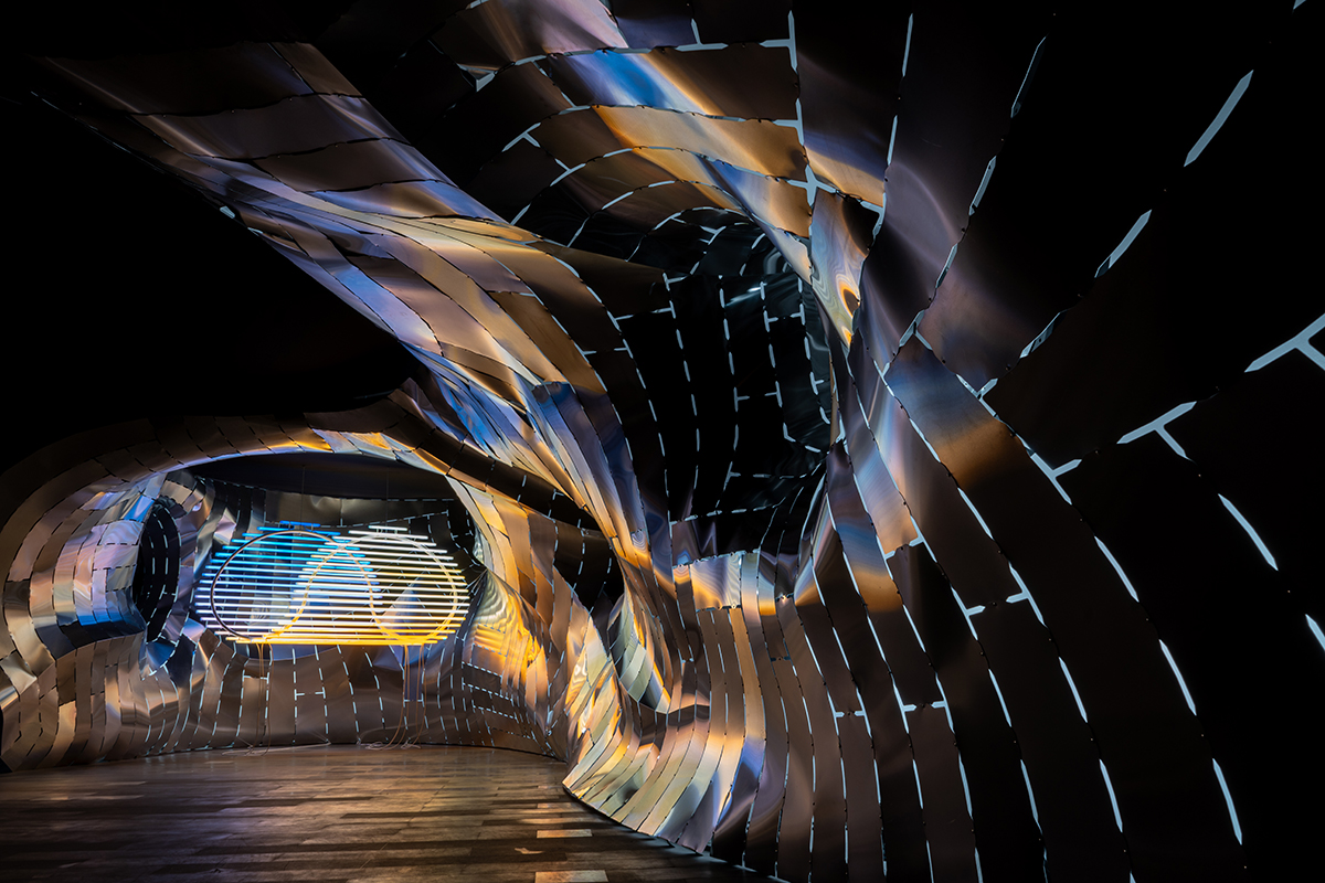 L’ambiente progettato con strumenti di design parametrico di tipo generativo è interamente realizzato in alluminio tagliato con una tecnica denominata mesh clustering, per ottimizzare l’uso del materiale, la realizzazione a controllo numerico e l’assemblaggio a secco. Questo consentirà, a fine mostra, di disallestire l’opera e riutilizzare il materiale nella filiera del riciclo. Il sole doppio è una forma-oggetto composta dalla sfera incipiente e dal suo doppio, che è anche un’ombra luminosa, un inconcepibile cortocircuito sulla questione della fonte della luce e del calore. La mostra, nel dialogo tra arte, architettura e museografia, propone al pubblico un’esperienza personale, in cui la dilatazione del momento dell’alba cristallizza uno stato di attesa, un tempo sospeso e pone l’osservatore di fronte a quesiti su un futuro sempre più innaturale ma nell’ottica di una reciprocità virtuosa fra natura e tecnologia. Fra passato e futuro, il visitatore incarna il presente. Il paesaggio museografico desunto dall’immaginario digitale del metaverso, fa percepire il fascino del disagio di essere troppo vicini al sole. Una sensazione che genera la riflessione su grandi temi comuni e attuali, da affrontare con urgenza sempre maggiore: dai più evidenti, relativi al cambiamento climatico, a quelli di ricerca sul design di supporto alla riduzione degli sprechi e sulle materie prime.